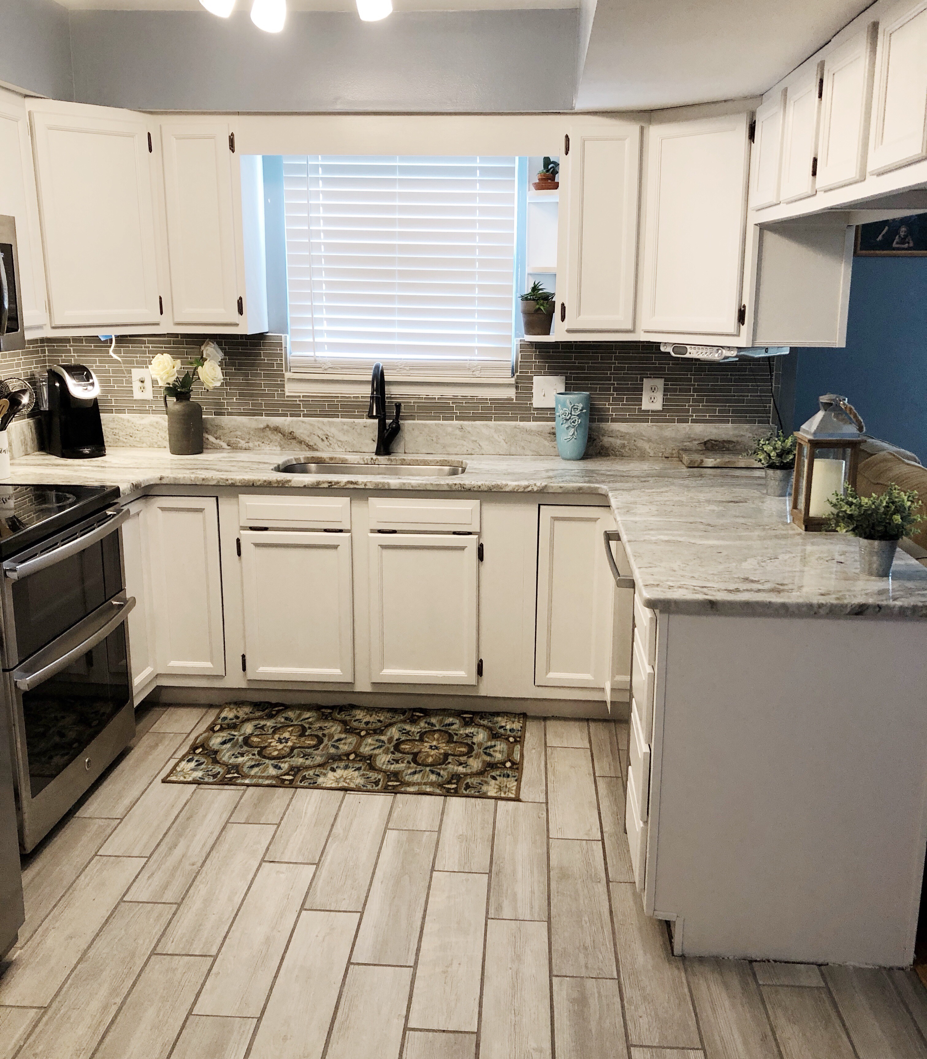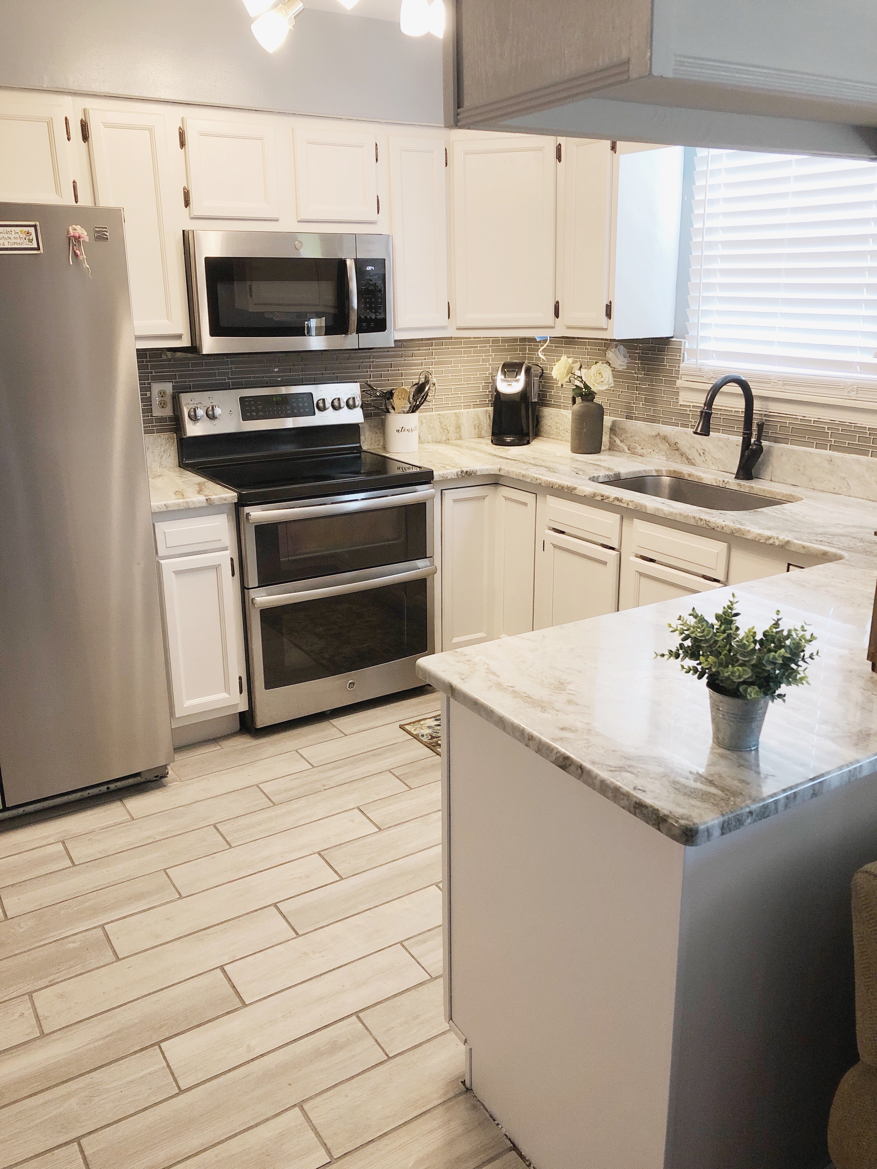 If you look closely, this kitchen is actually pretty up to date! There is beautiful granite, tile black splash, stainless steel appliances and trendy, ceramic wood looking tile. The outdated 1980’s oak cabinets completely take away from all of the beautiful updates! To really make this kitchen stand out, we needed to give the cabinets a beautiful contrasting color to really bring it all together.